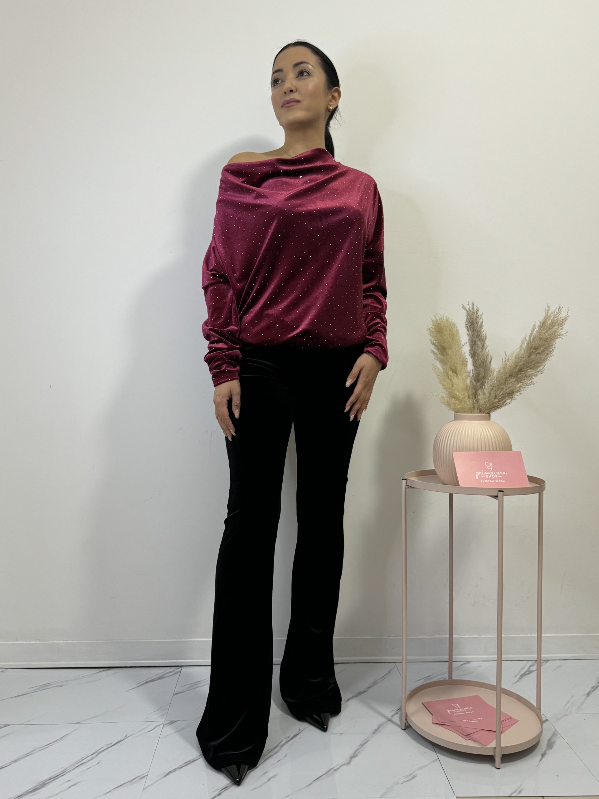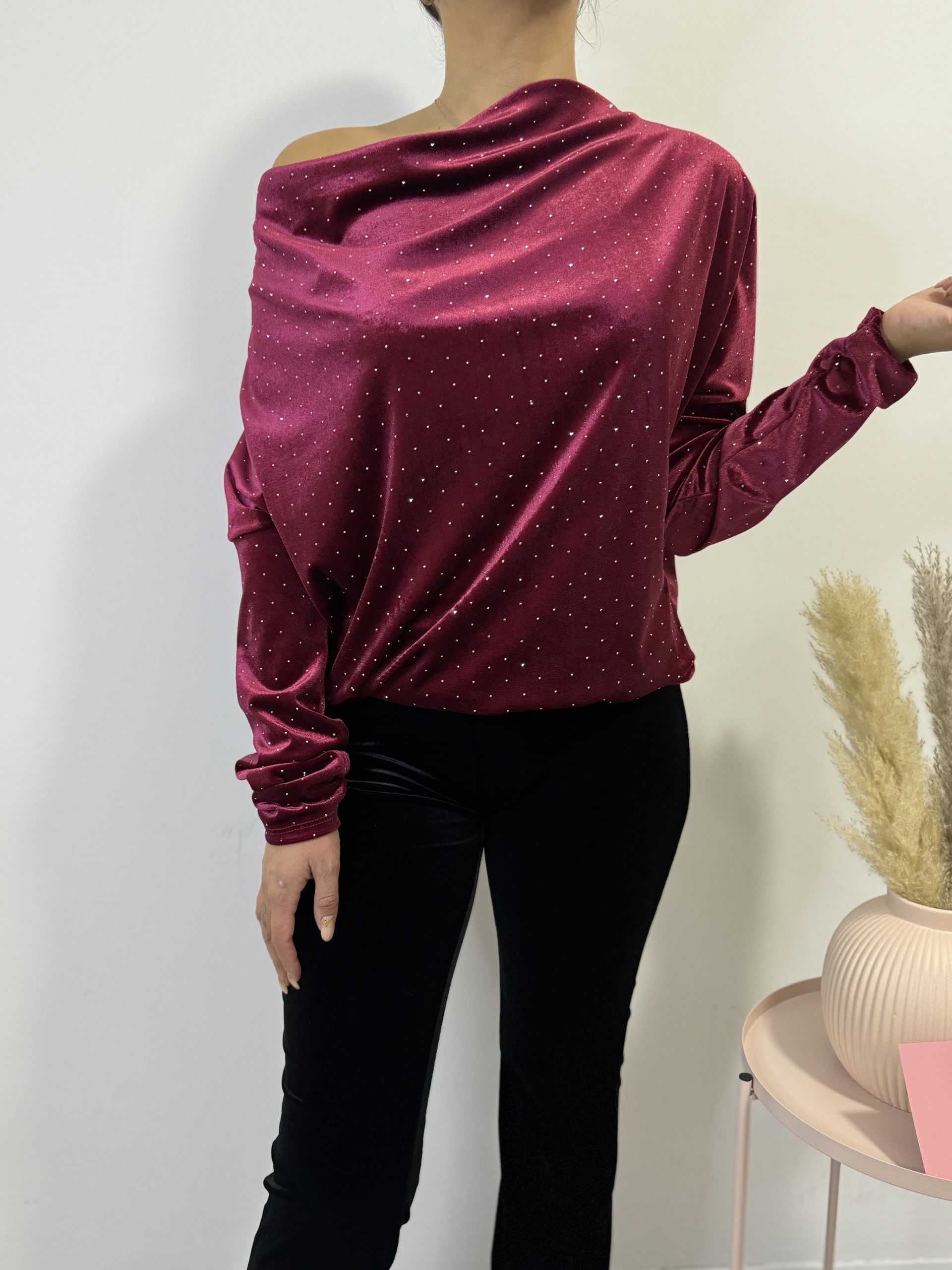 Maglia super morbida in ciniglia bordeaux con strass, vestibilità comoda con spalla scoperta