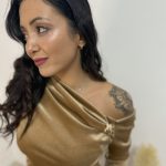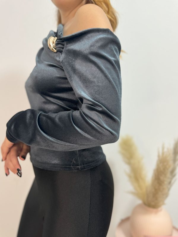 Maglia a maniche lunghe in ciniglia con spalla scoperta, dettaglio dorato
