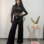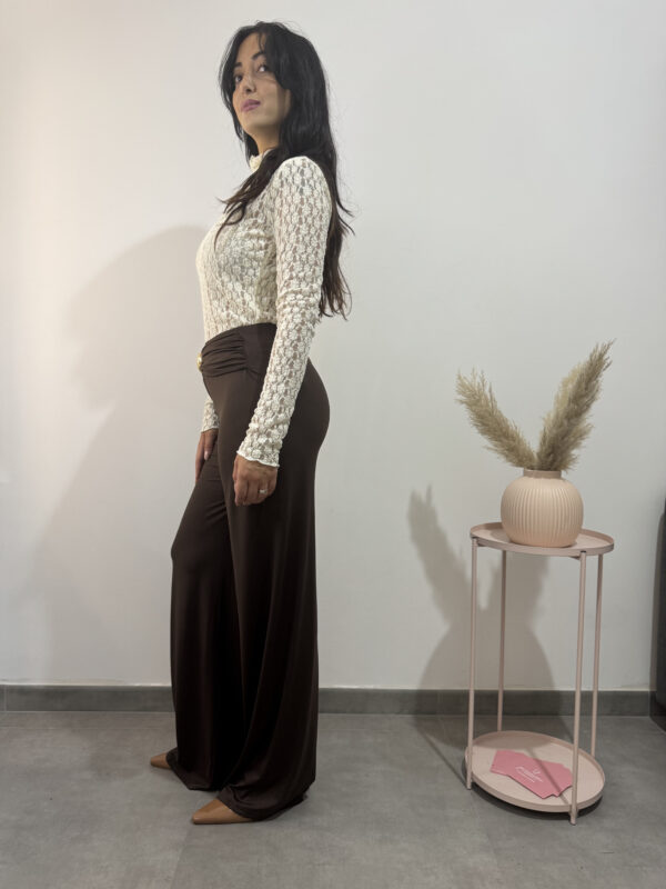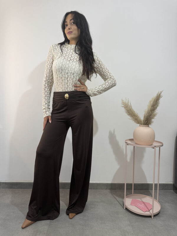 Pantalone elegante a gamba larga, tessuto liscio elasticizzato con pieghe e fibbia in vita.