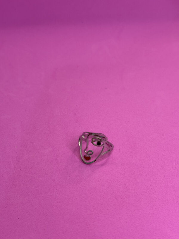 Bellissima fedina argentata regolabile a forma di viso stilizzato. Design artistico contemporaneo.