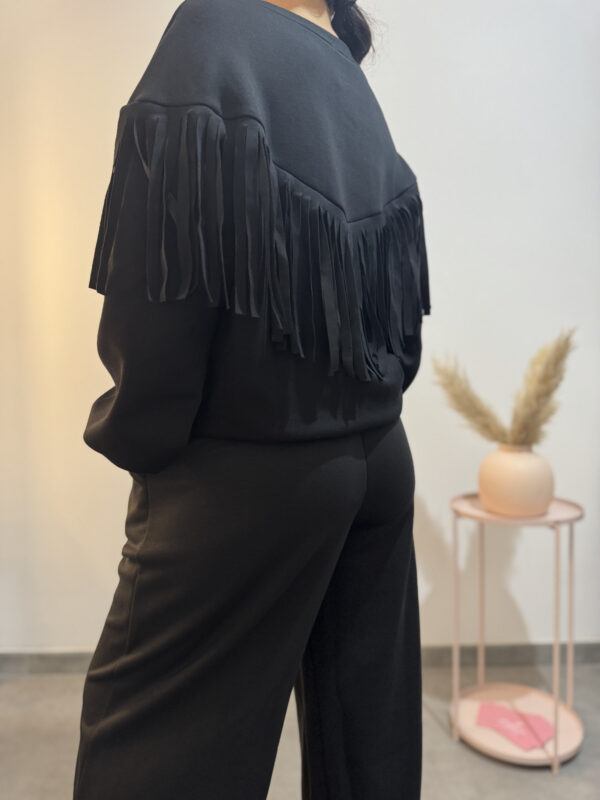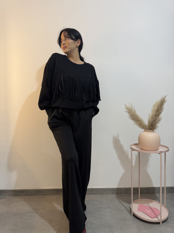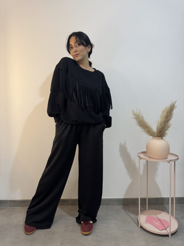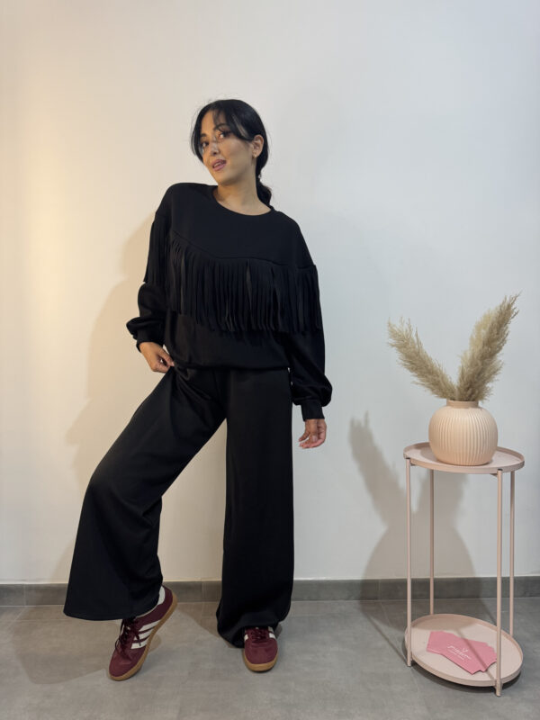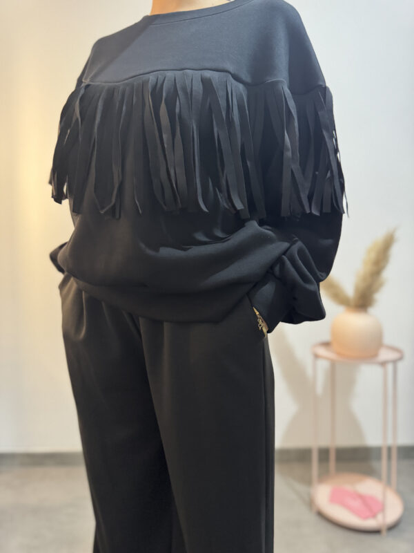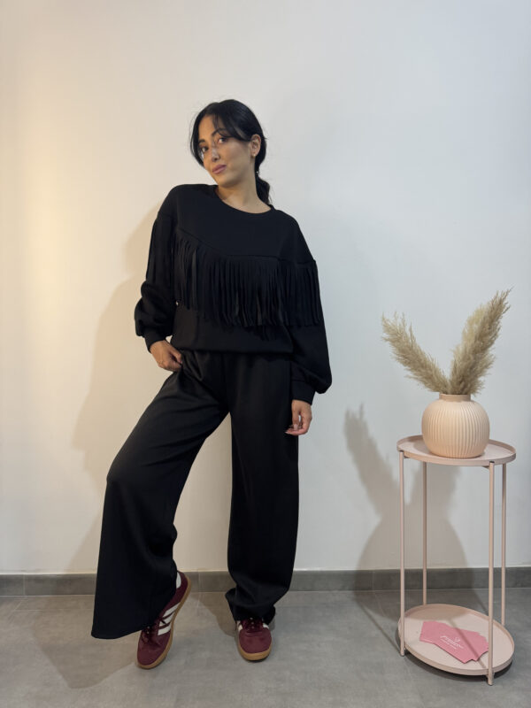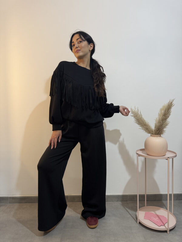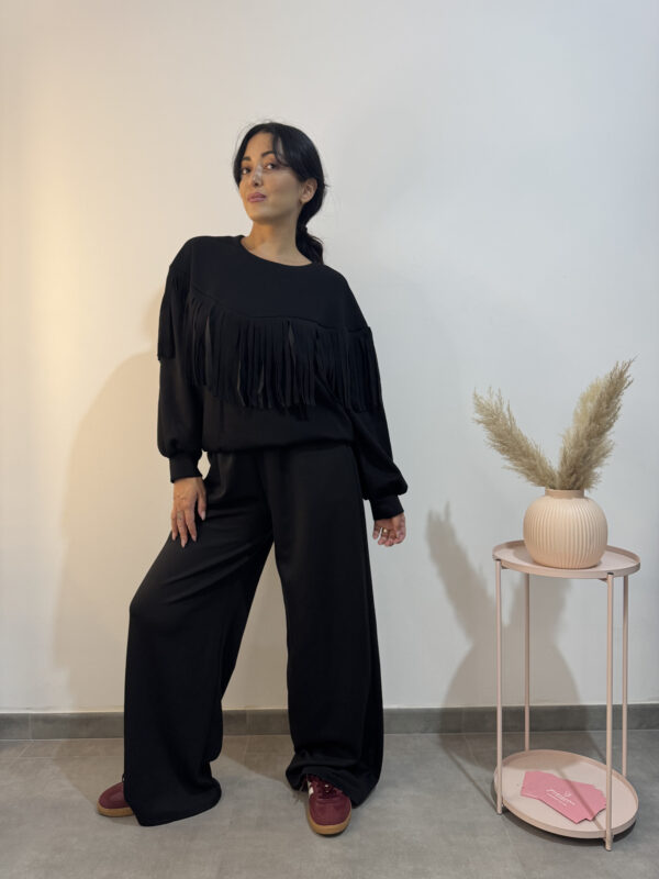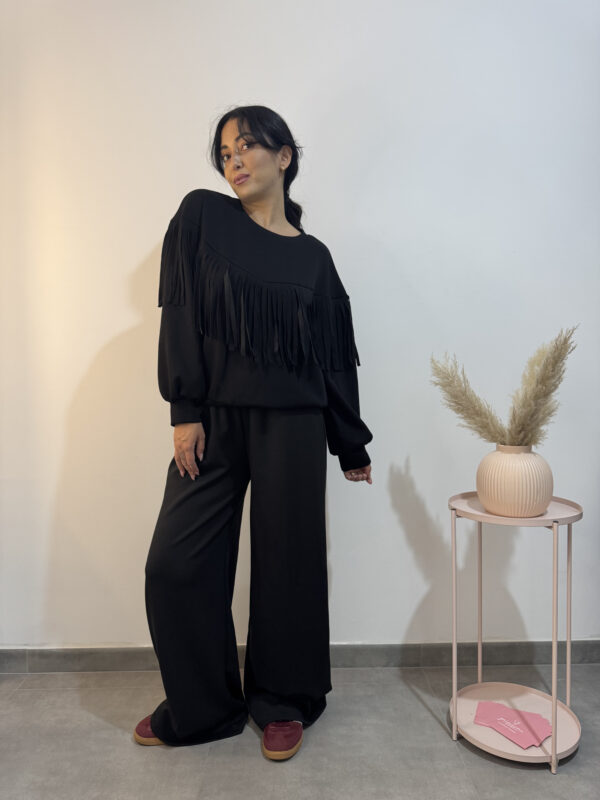 Completo sportivo composto da pantalone largo con elastico in vita e maglioncino con frange.