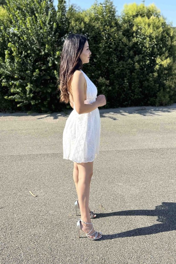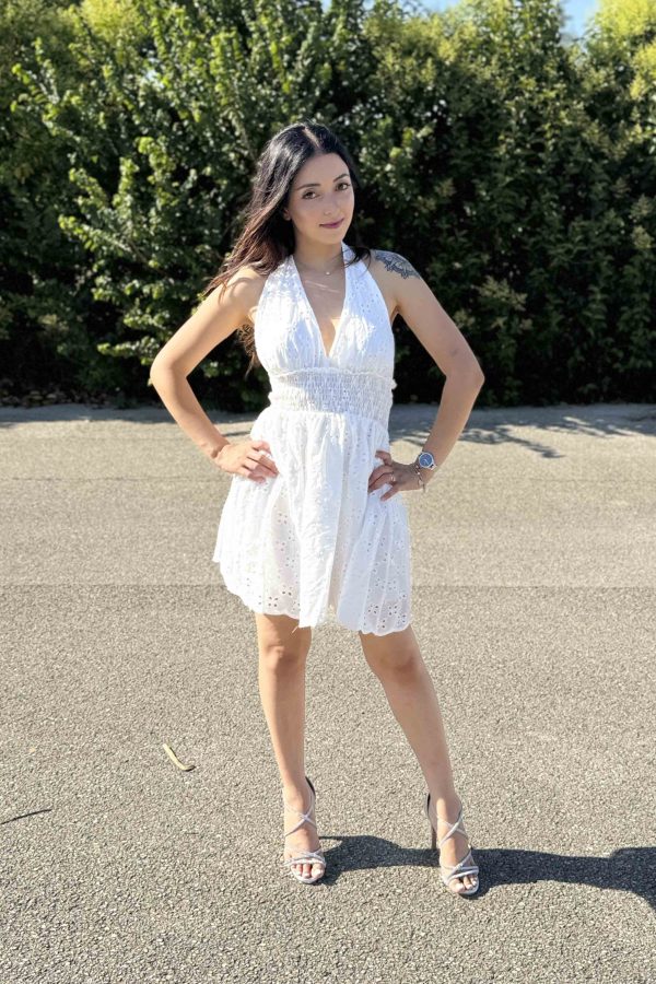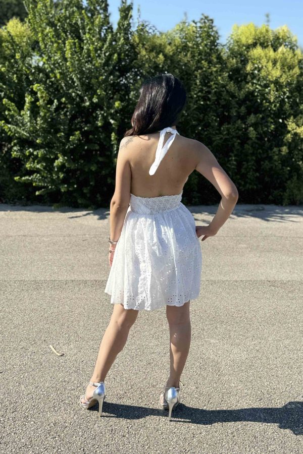 Vestito in stile pizzo san gallo, molto estivo e raffinato, schiena scoperta, allacciatura al collo, elastico in vita e gonna svasata.