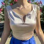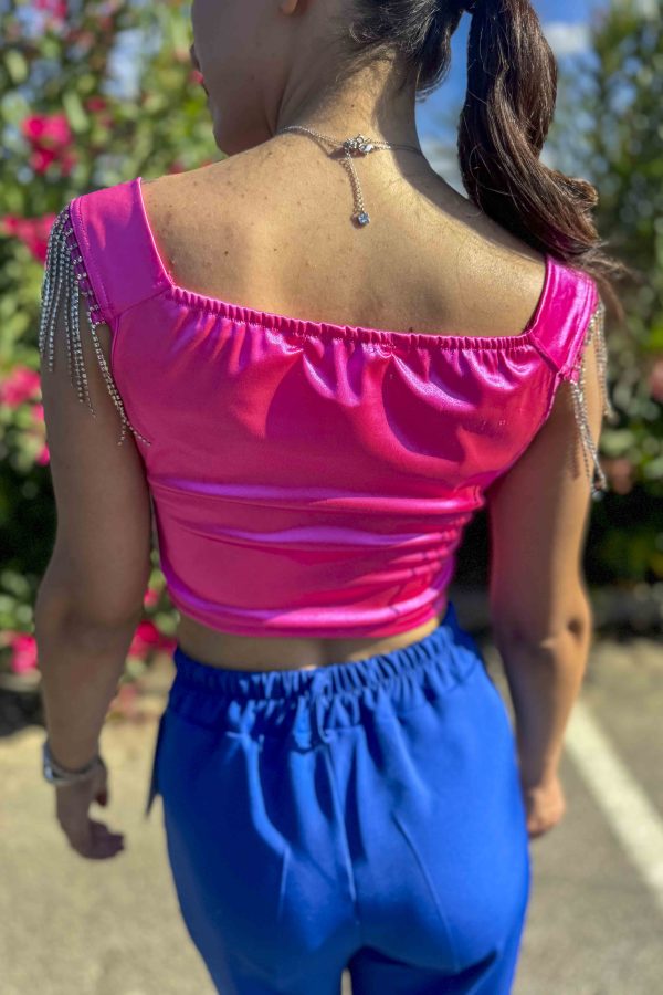 Top corto fucsia, satinato, scollo a V, favoloso dettaglio sulle maniche: pendenti luminosi