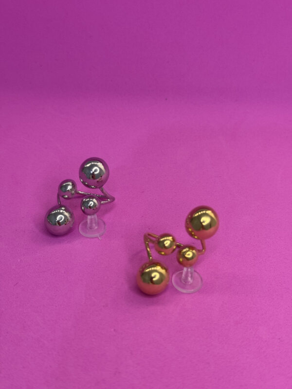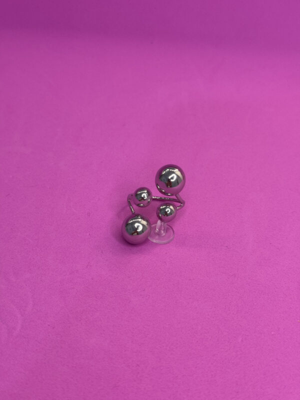 Anello argentato con sfere grandi e piccole, fedina regolabile.