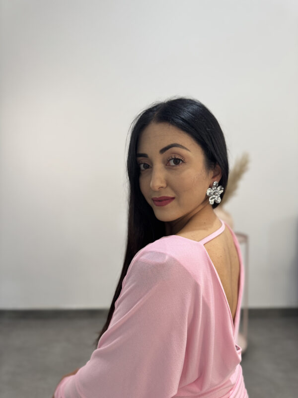 Delizioso abitino rosa della linea Lumina, in maglina morbido, fresco e leggero, adatto alla stagione estiva. Vestitino corto, a maniche lunghe, scollo profondo sulla schiena, fusciacca da portare corta o lunga e fibbia argentata. Abbinalo a scarpe col tacco o sandalo basso, per i tuoi aperitivi in piscina e feste in discoteca!