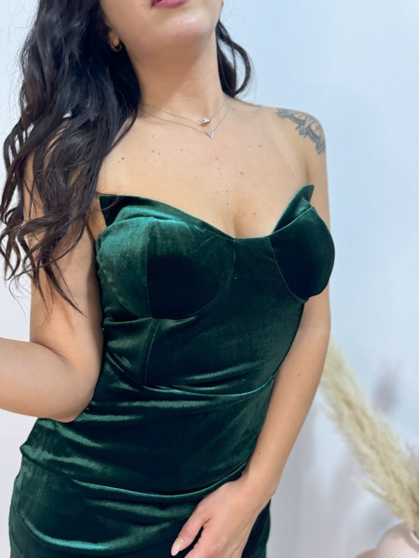 Graziosissimo abitino in velluto a corpetto e gonna drappeggiata e spacco laterale ideale per le festività natalizie