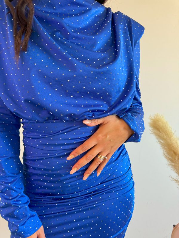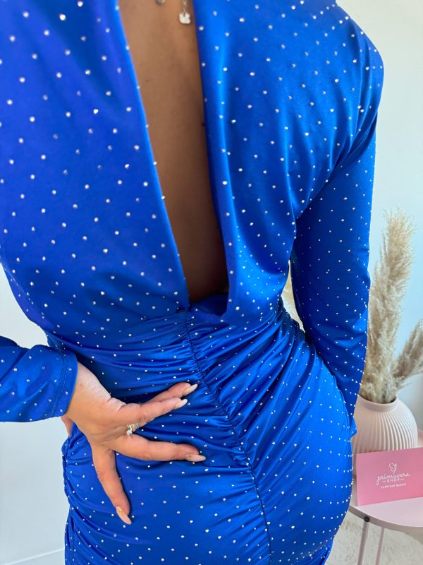Abito sopra al ginocchio a maniche lunghe con strass tessuto elasticizzato parte alta svasata chiusura a bottoncino