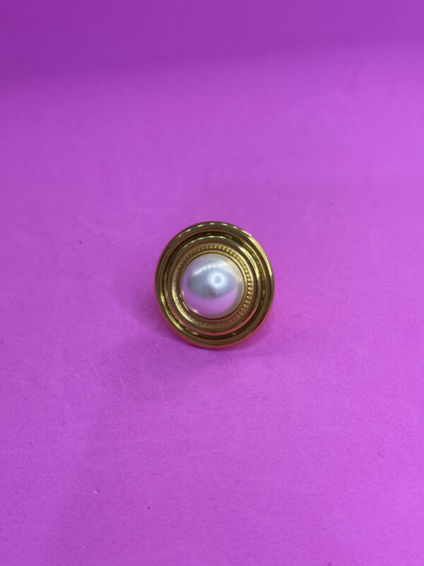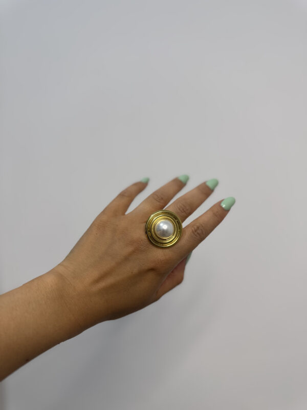 Anello rotondo dorato con perla centrale. Dona ai tuoi look uno stile retrò e raffinato.