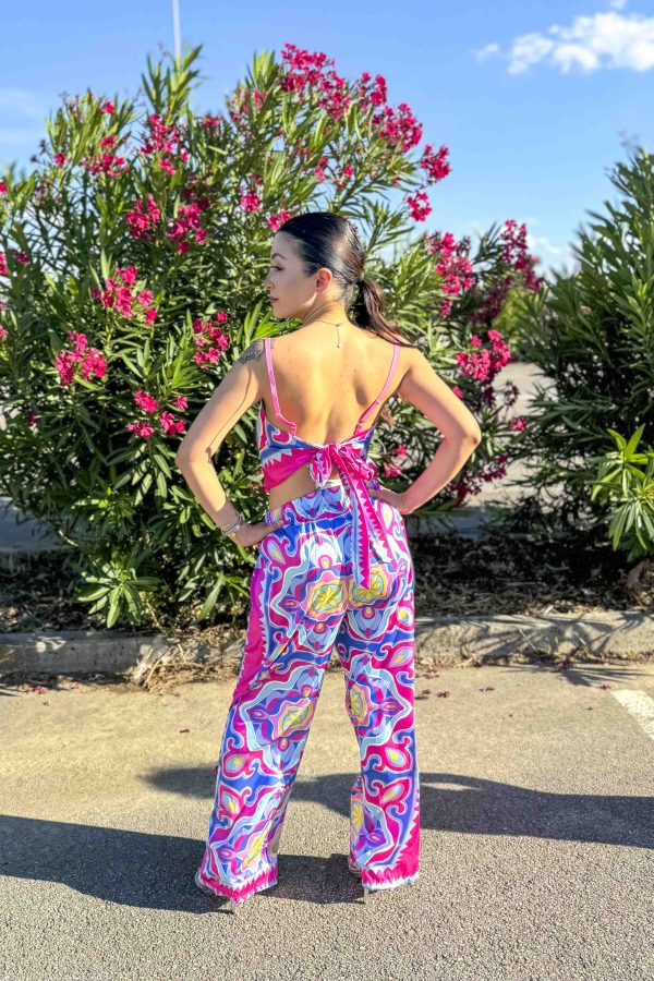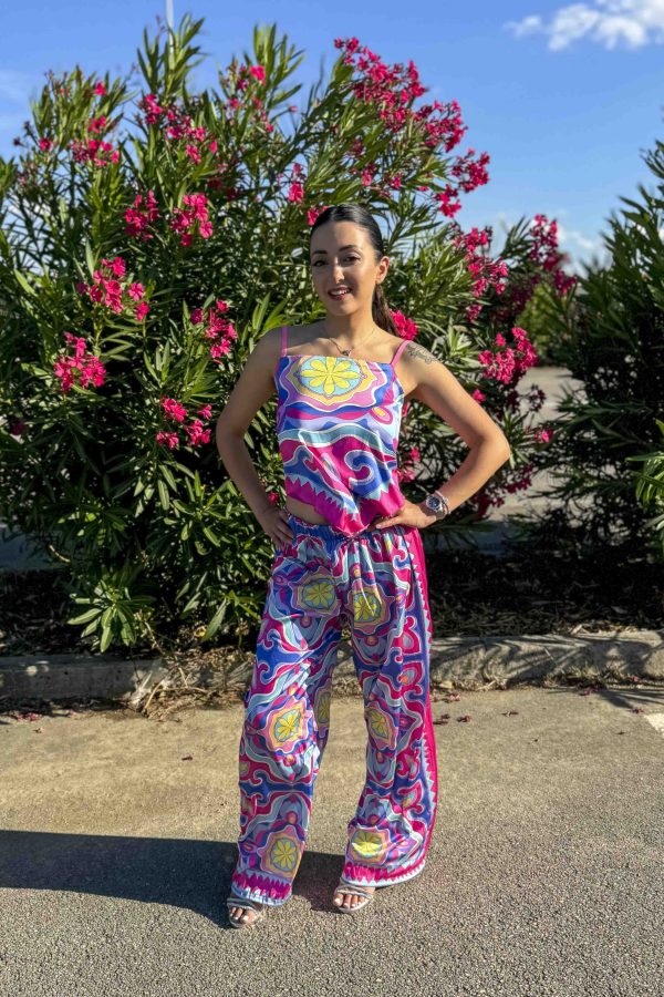 Completo camicetta a mezze maniche, bottoncini e tascone; pantalone cerniera, bottoni e passanti per cinta. Deliziosa spilla estraibile con dettaglio rosellina