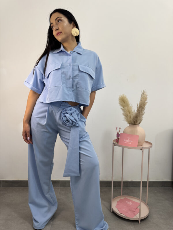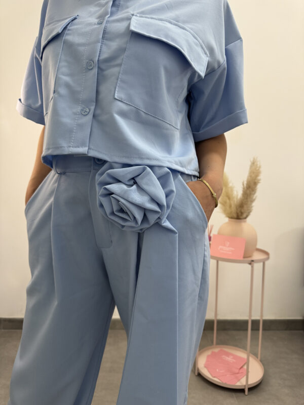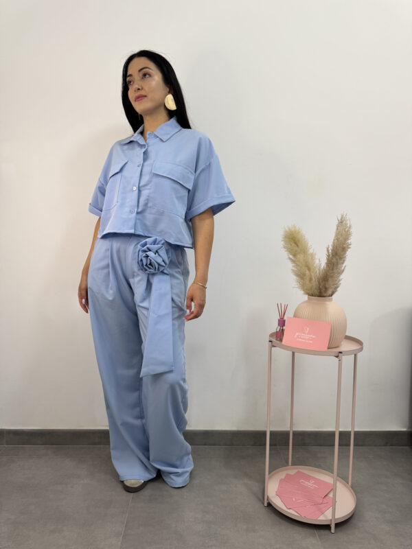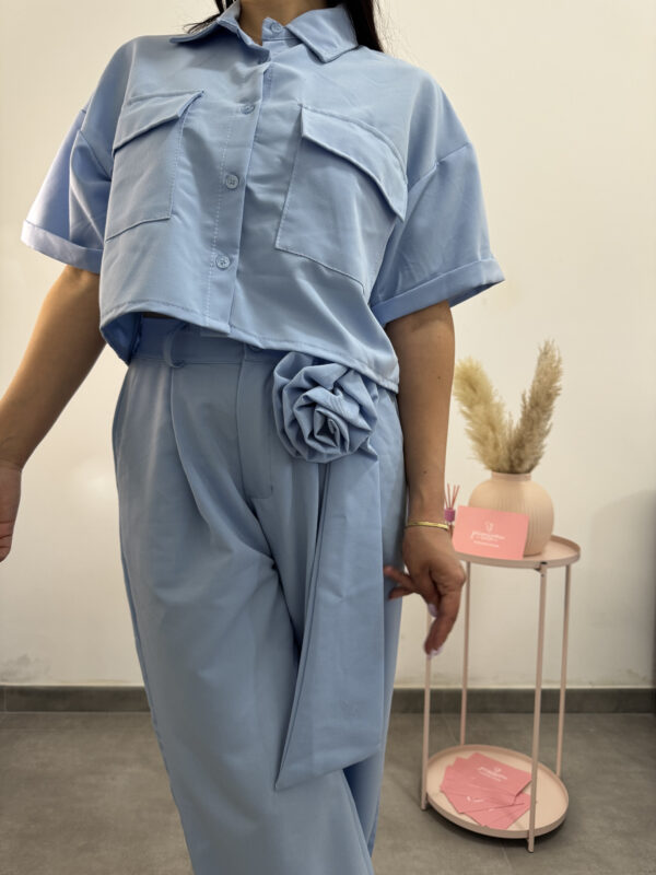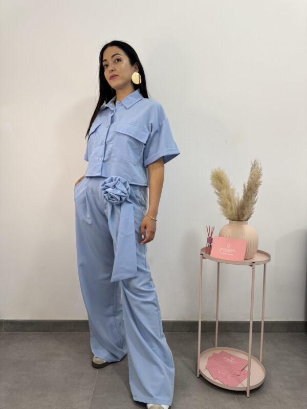 Coordinato azzurro primaverile camicetta + pantalone. Camicia fresca, corta, a mezze maniche, bottoncini e tasconi; pantalone fresco largo con cerniera bottone e passanti per cinta. Deliziosa spilla a forma di fiore e fusciacca. Un completo originale e colorato, vestibilità sia sportiva che elegante.