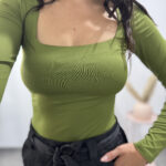 Maglietta in tessuto liscio aderente elasticizzato, a maniche lunghe, scollo dritto.