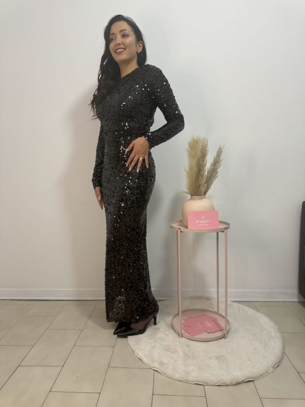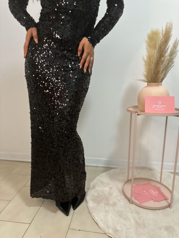 Abito da festa lungo a maniche lunghe scollato sulla schiena con laccetto impreziosito da paillettes