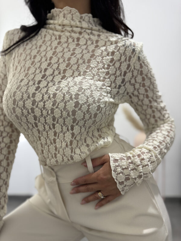 Maglia in pizzo color panna a maniche lunghe e collo alto.