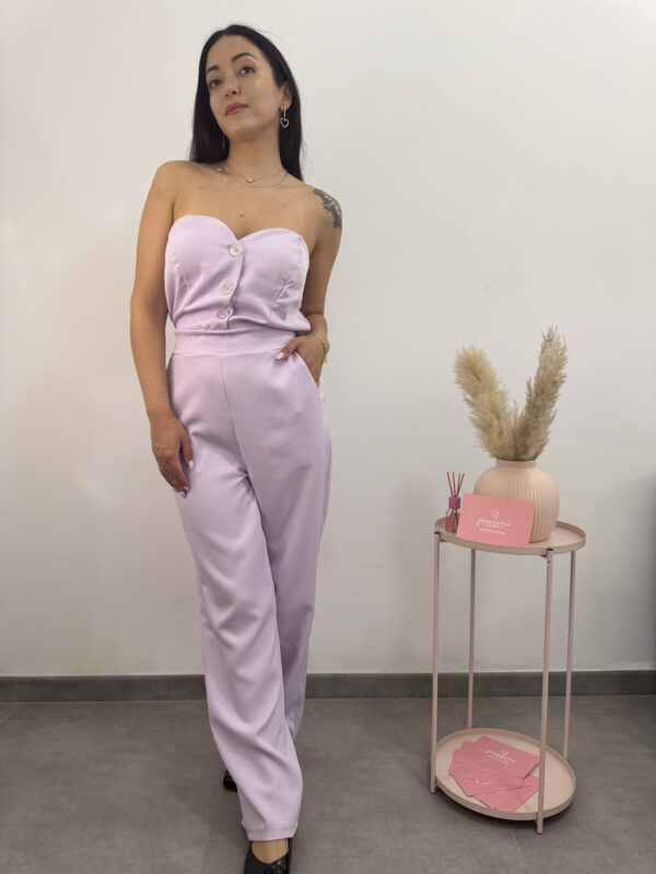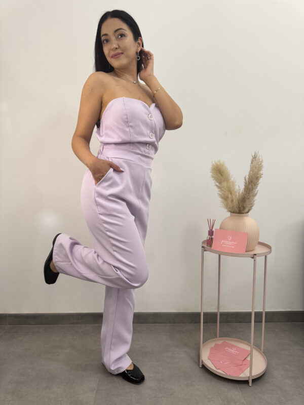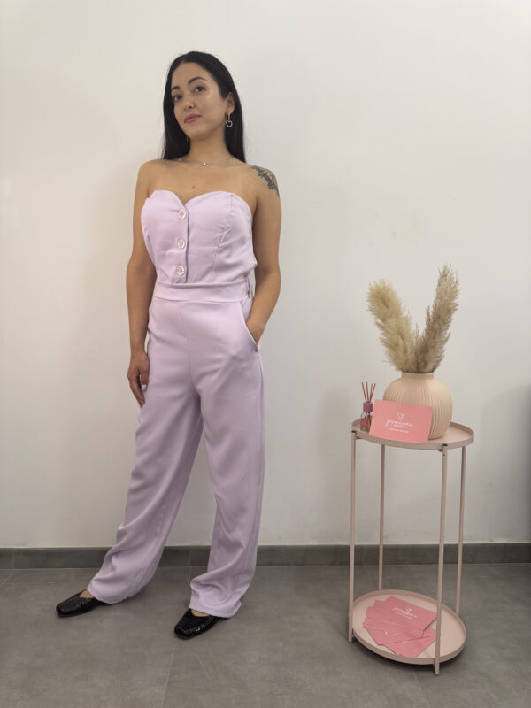 Tuta intera lilla elegante, top scollo a cuore e bottoni, pantalone largo morbido con tasche. Da abbinare sia a scarpe eleganti sia a sneakers handball.