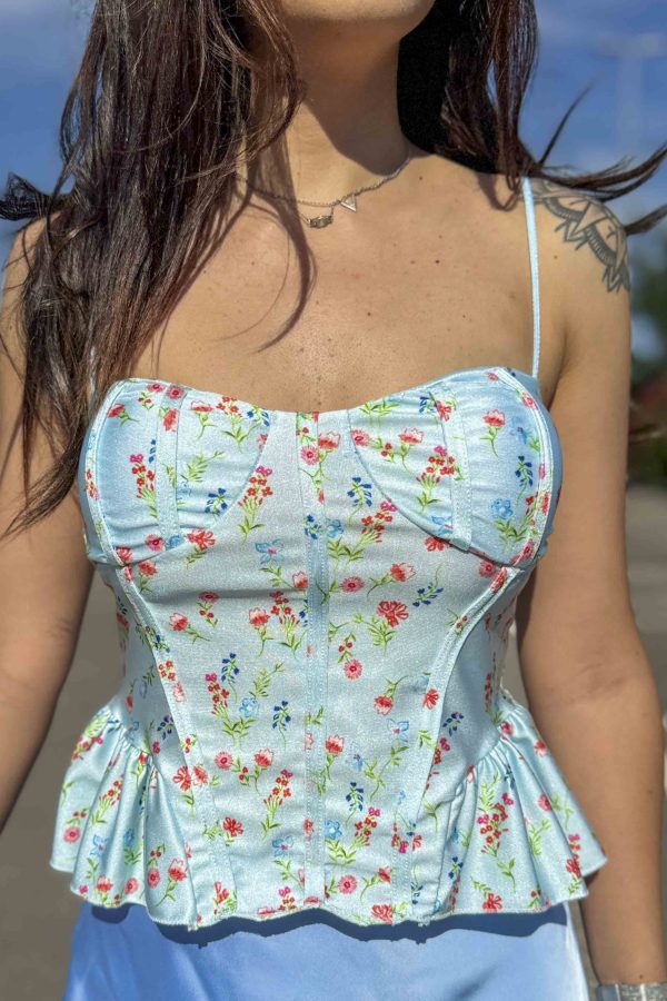 Top stile bustino con bretelline e rouches sul bordo. Fantasia floreale.