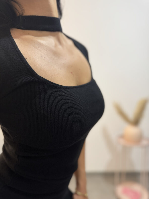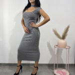 Completo in maglina composto da maglia a maniche corte con scollo ampio e gonna longuette, tessuto elasticizzato.