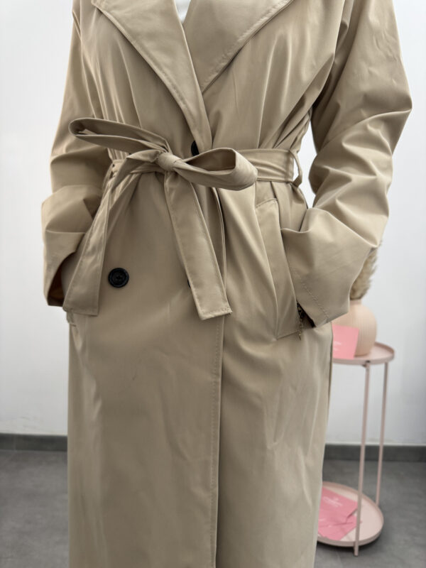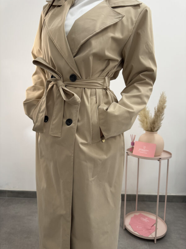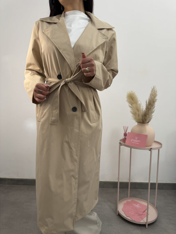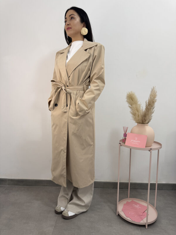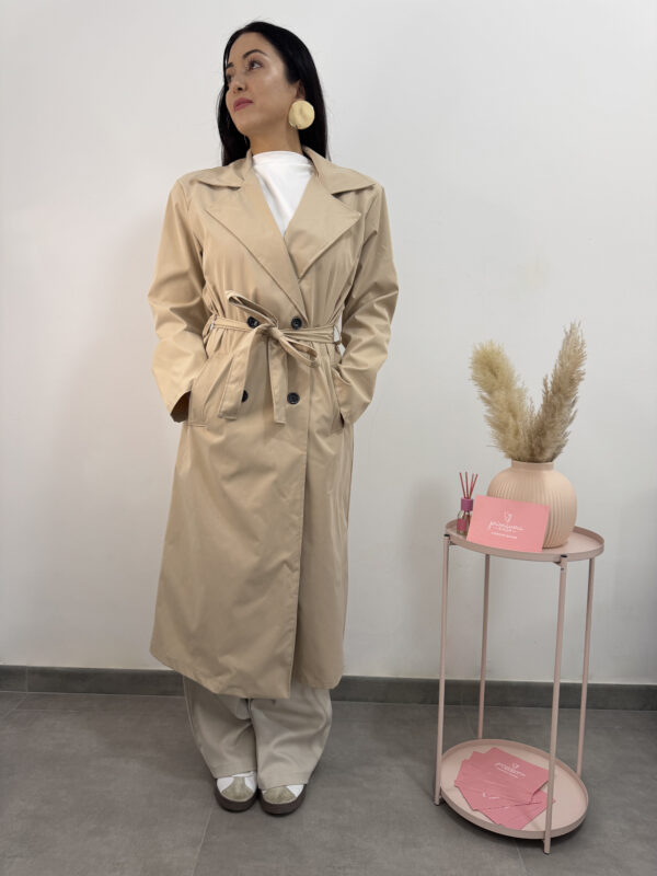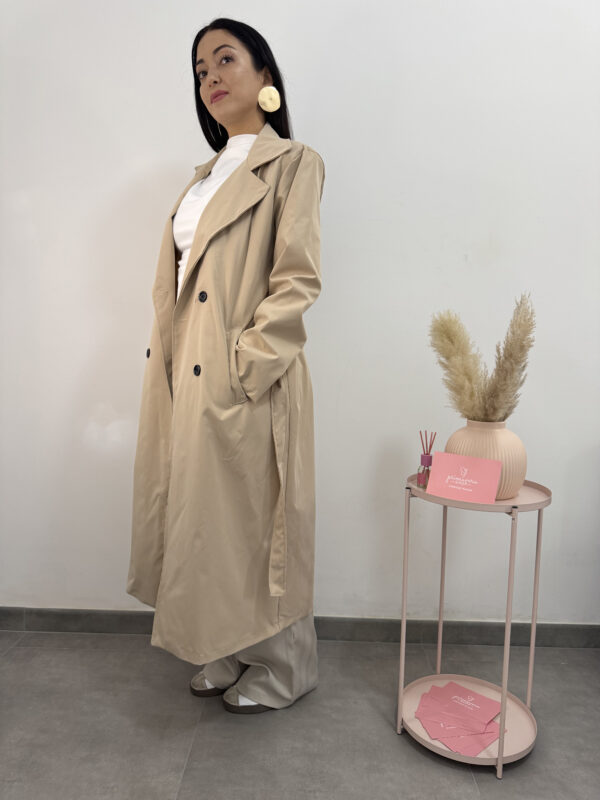 Favoloso trench lungo beige. Modello intramontabile molto in voga nella stagione 2025, vestibilità elegante, di classe, casual. Tessuto liscio, spalline, bottoncini neri e cintura in vita.