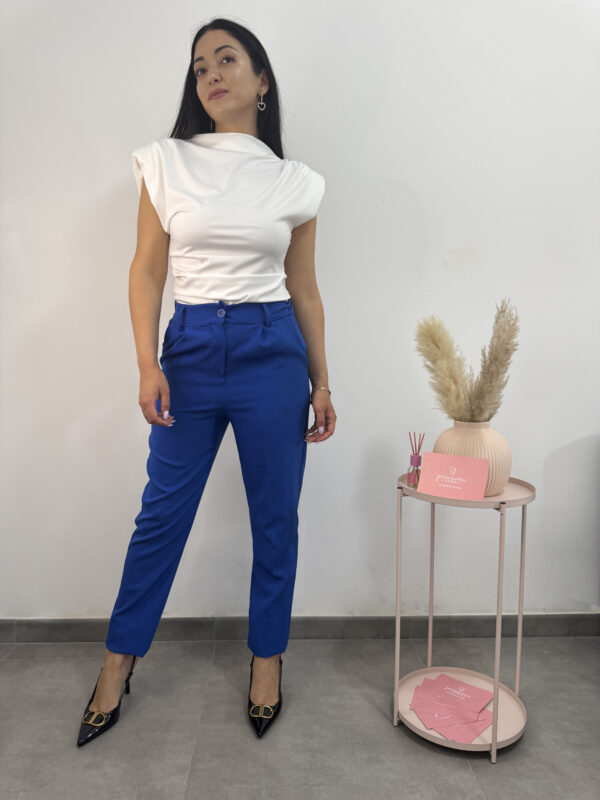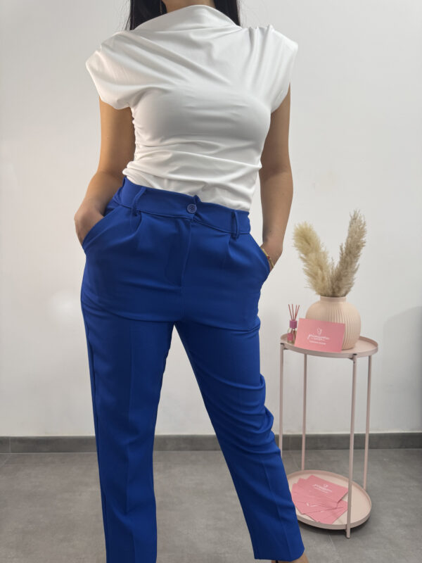 Pantalone formale blu, modello a sigaretta con tasche laterali e bottoncino, vestibilità comoda, tessuto fresco, leggero ed elastico. Vestibilità sia elegante che casual, per le tue giornate primaverili, i tuoi aperitivi e serate eleganti.