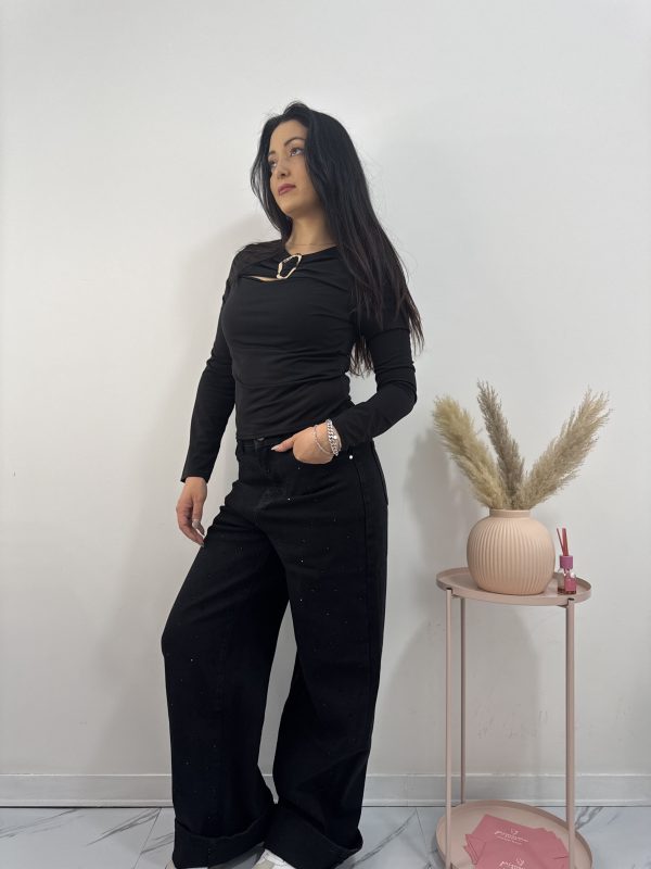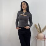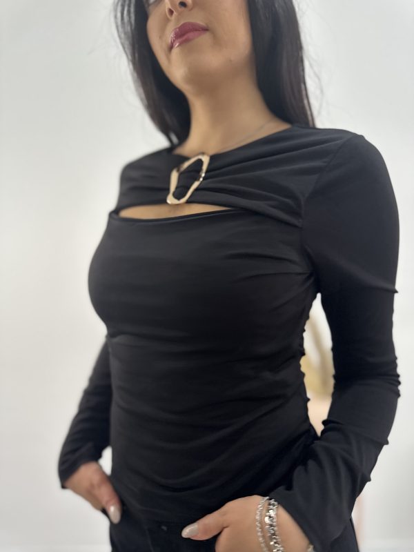 Top a maniche lunghe, tessuto tecnico aderente e adatto ad ogni fisicità, modello cut out con taglio e dettaglio dorato sul seno.