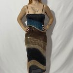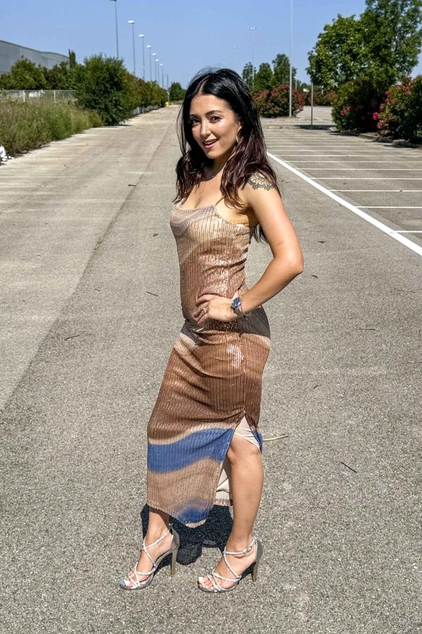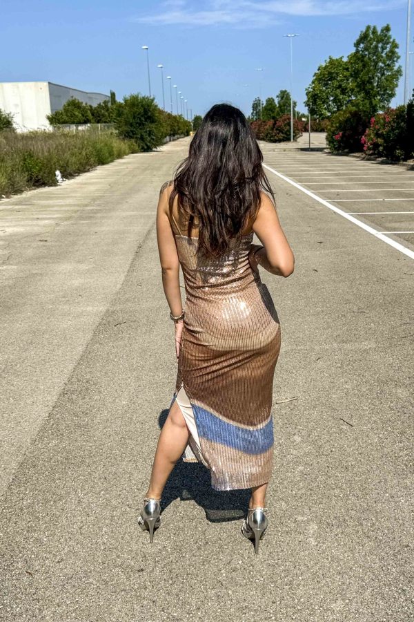 Vestito lungo in paillettes con bretelline, a fantasia sfumata oro/bronzo/azzurro. Luminoso, perfetto per occasioni eleganti.