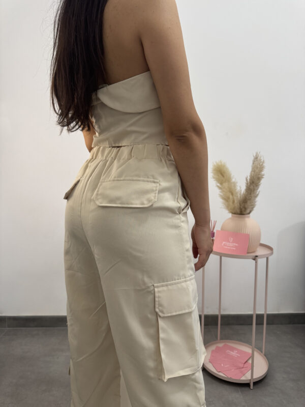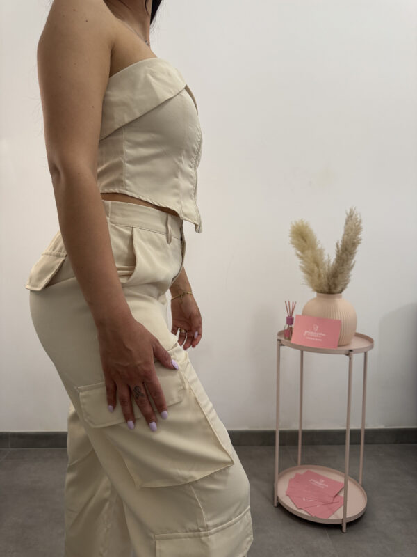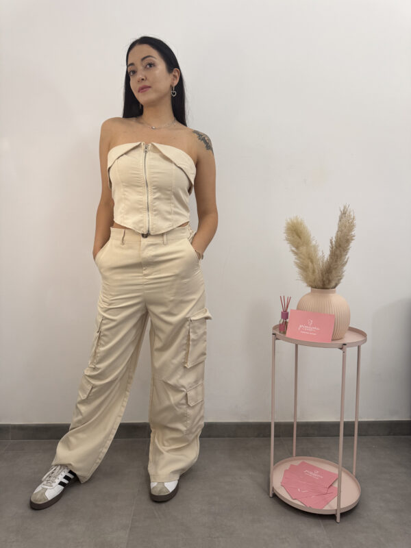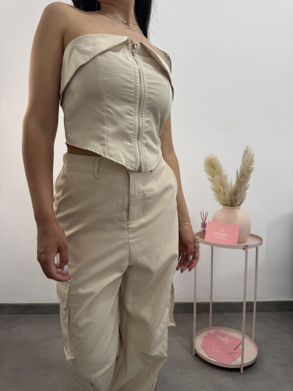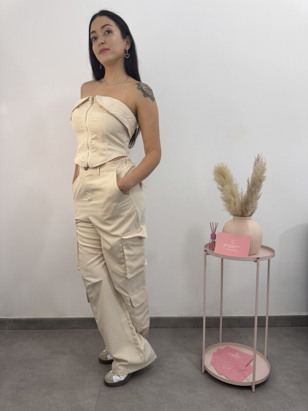 Coordinato beige urban style composto da top con cerniera e pantalone cargo con tasconi laterali. Modello sporty chic, ultima moda, super trendy!