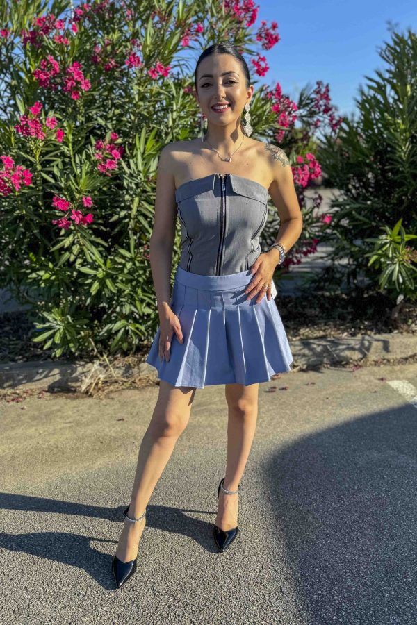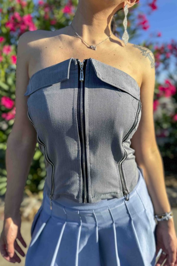 Top urban style a fascia con colletto, chiusura a cerniera, e altre due cerniere laterali.
