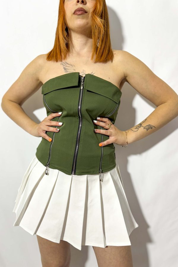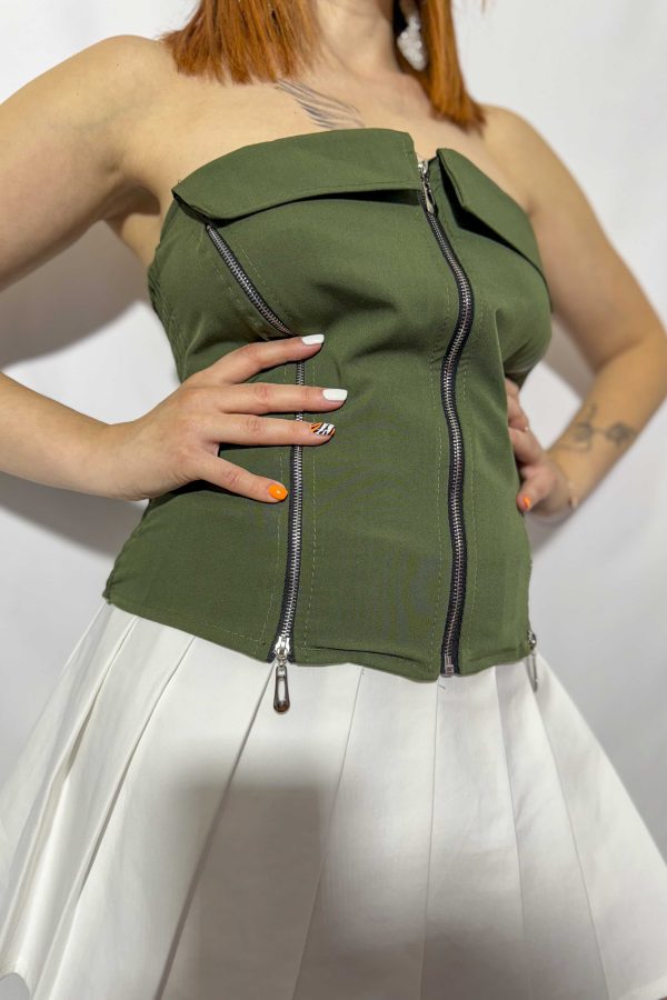 Top urban style a fascia con colletto, chiusura a cerniera e altre due cerniere laterali.