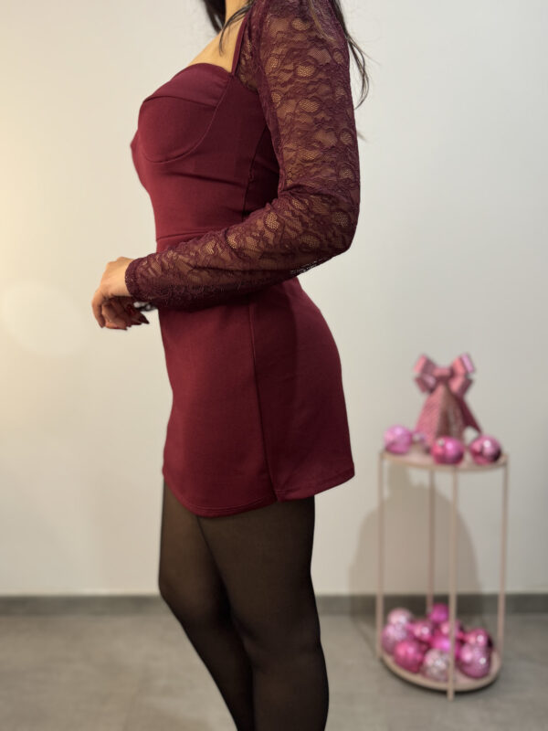 Tutina a pantaloncino con scolla a cuore coppette incorporate e maniche lunghe in pizzo.