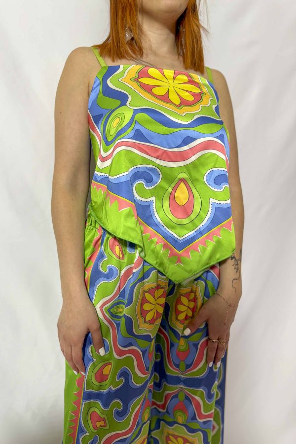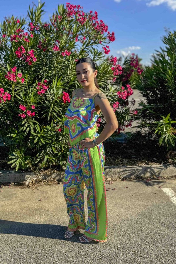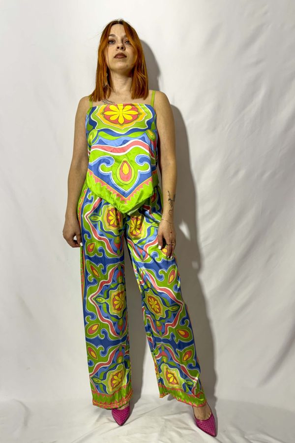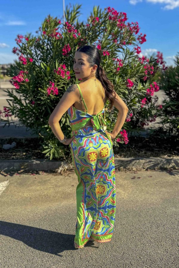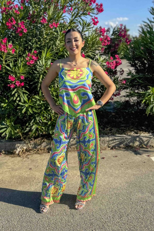 Completo camicetta a mezze maniche, bottoncini e tascone; pantalone cerniera, bottoni e passanti per cinta. Deliziosa spilla estraibile con dettaglio rosellina.