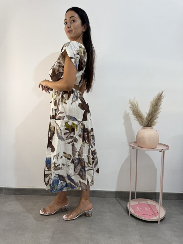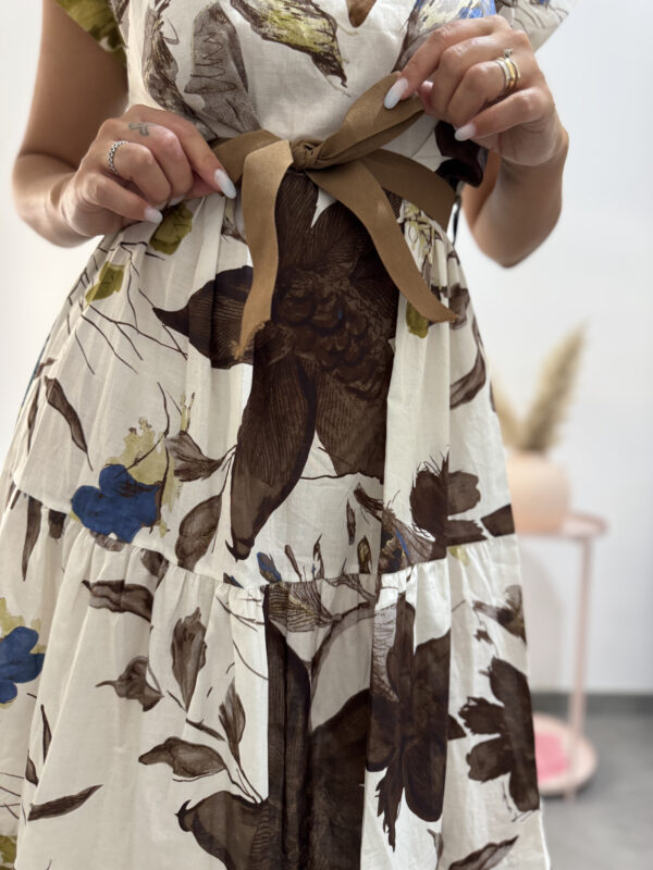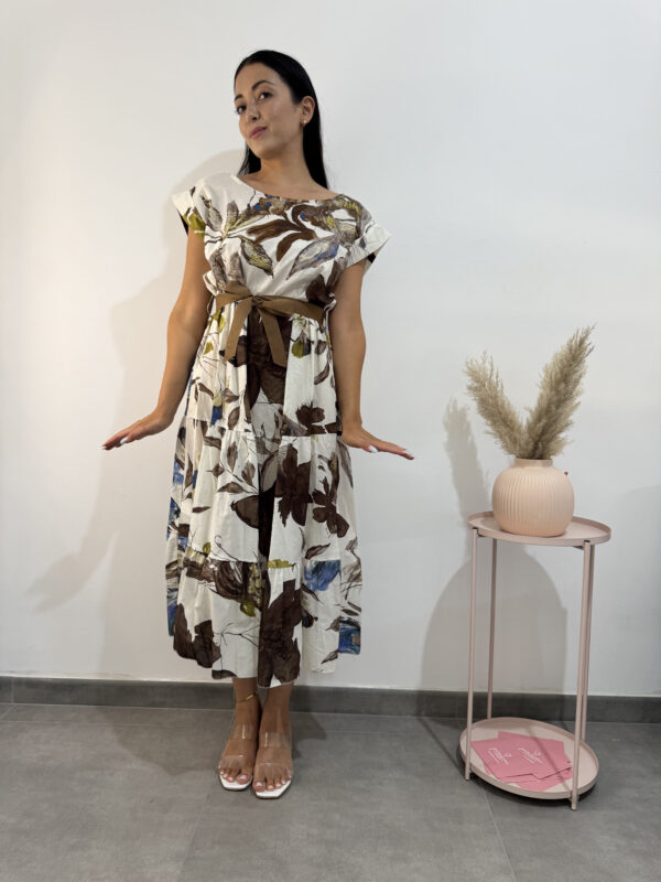 Vestito in 100% fresco cotone, modello alla caviglia con scollo ampio, elastico in vita, fantasia floreale nelle tonalità del bianco/marrone/verde/blu.