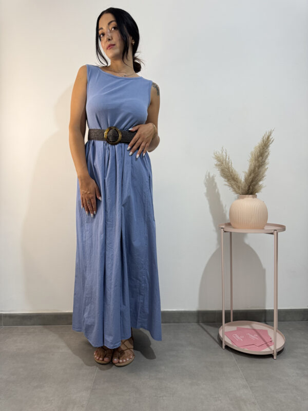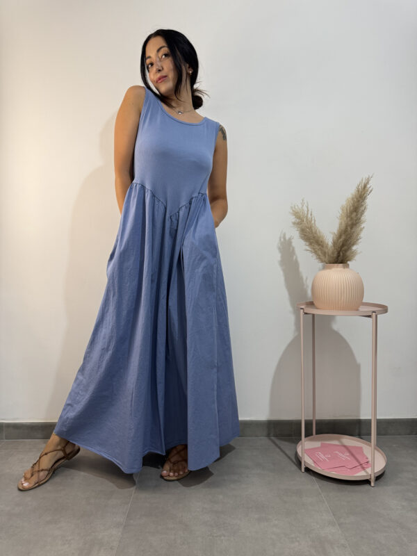 Maxi abito lungo 100% in cotone con top canotta a costine con cucitura a V, gonna ampia con tasche.