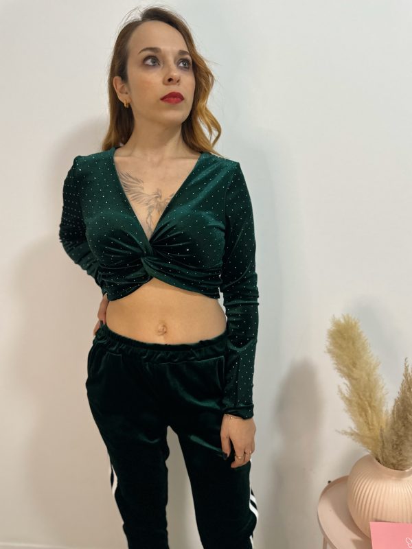 Crop top a maniche lunghe in ciniglia dettaglio nodo avanti tinta unita con strass