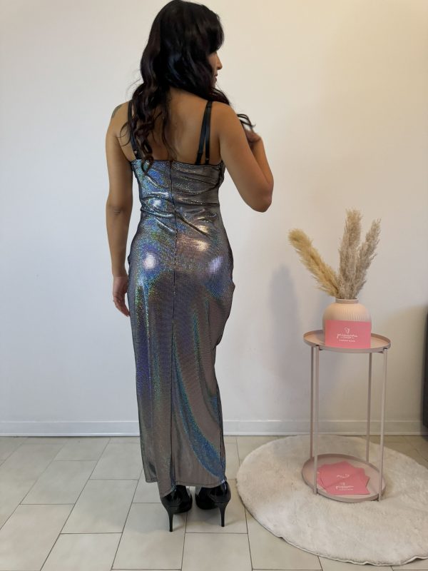 Abito luminoso lungo con bretelline drappeggiato con spacco