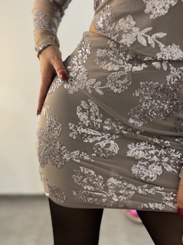 Completo ricamato composto da top a maniche lunghe e gonna corta, ricami floreali in paillettes.