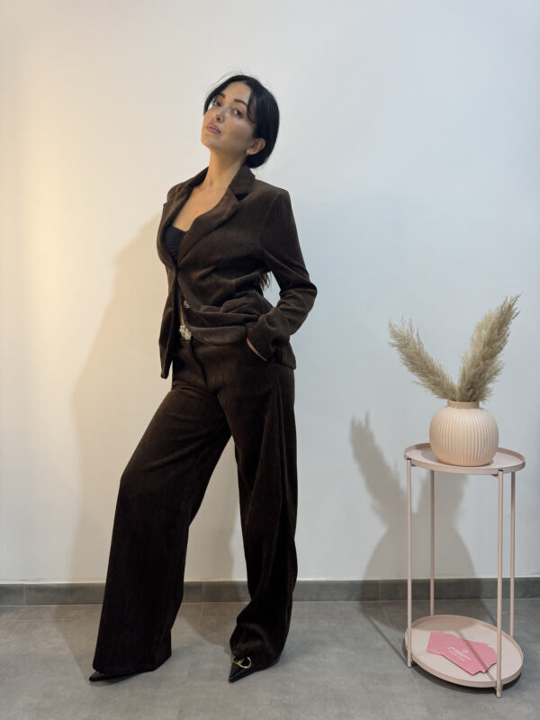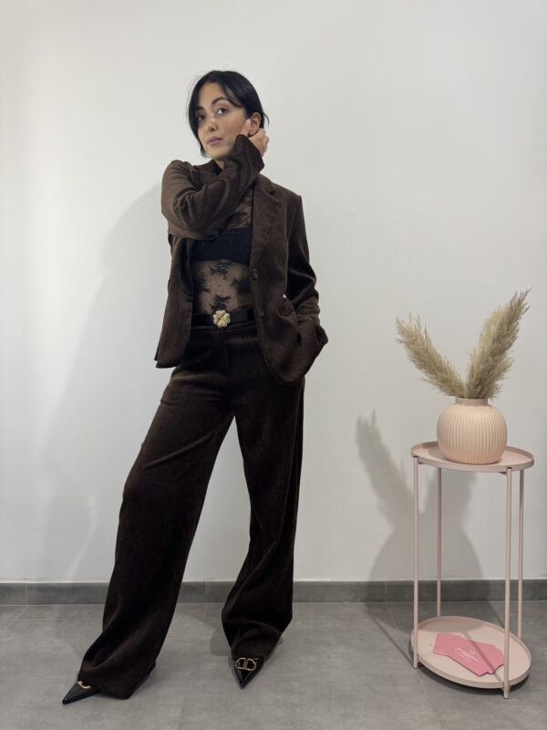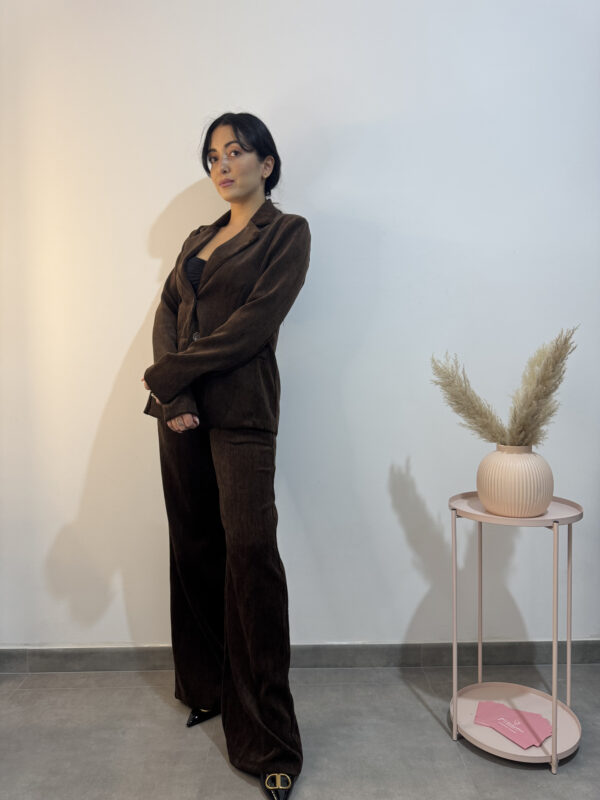 giacca formale doppio petto in velluto marrone scuro.