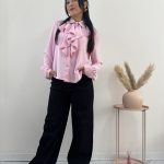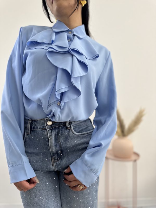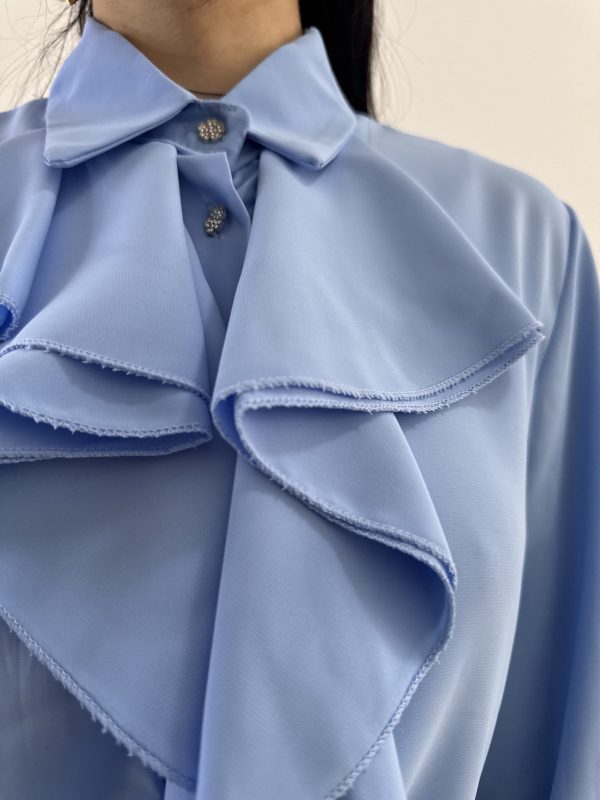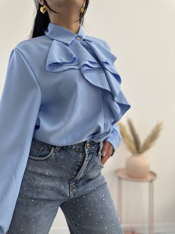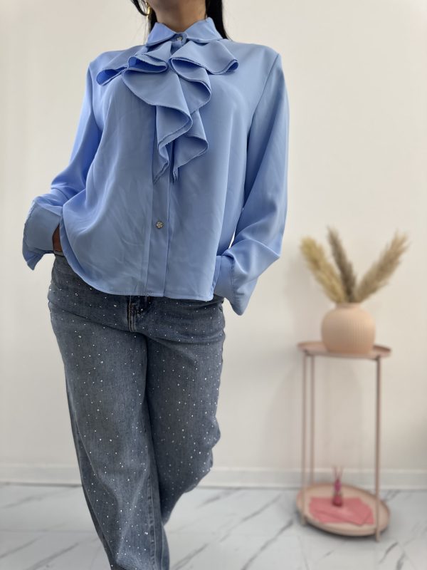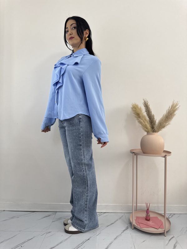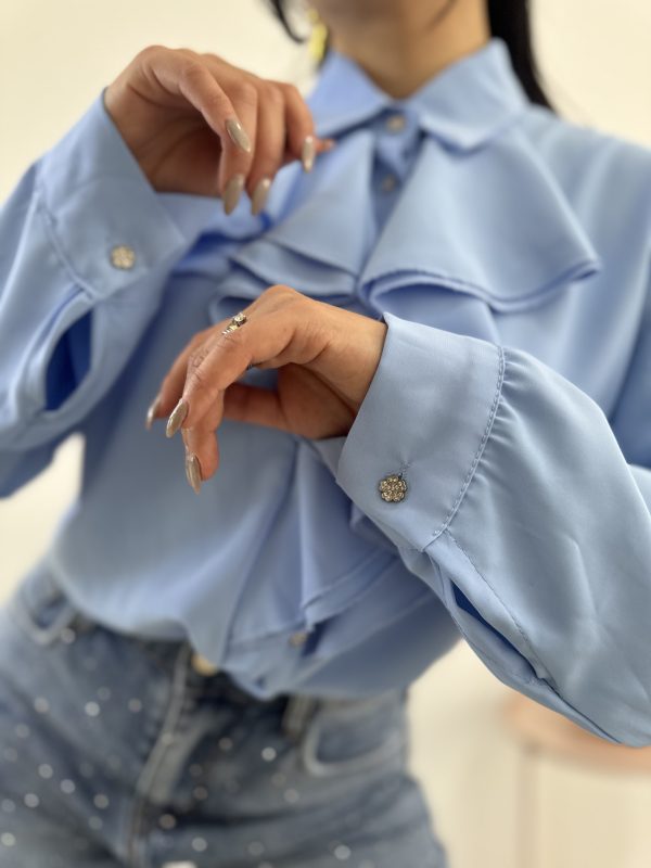 Camicetta a maniche lunghe con colletto, volant sul bordo e graziosissimi bottoncini a forma di fiore con strass.