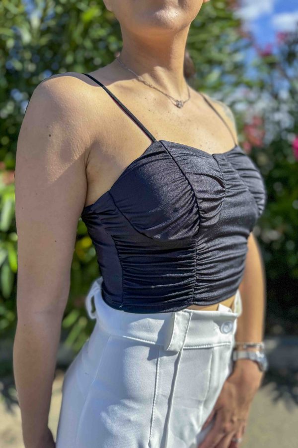 Top nero corto pancia scoperta, arricciato con push up, bretelline, elasticizzato