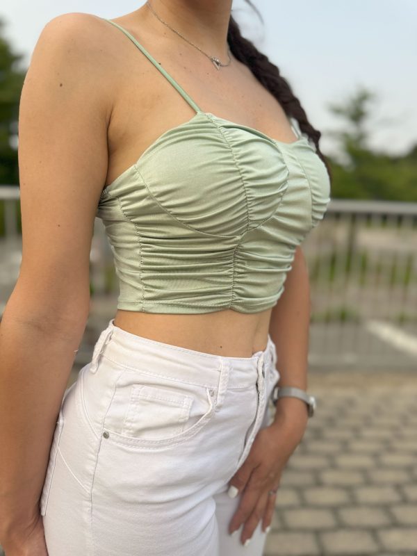 Top verde corto pancia scoperta, arricciato con push up, bretelline, elasticizzato