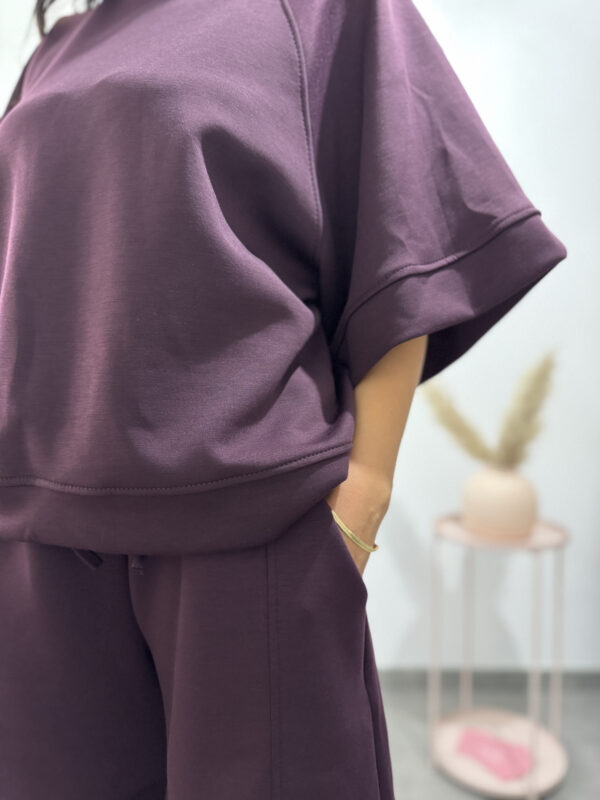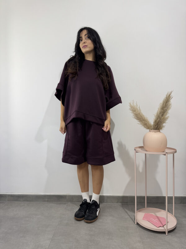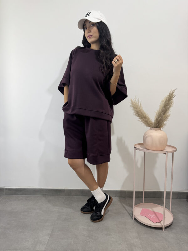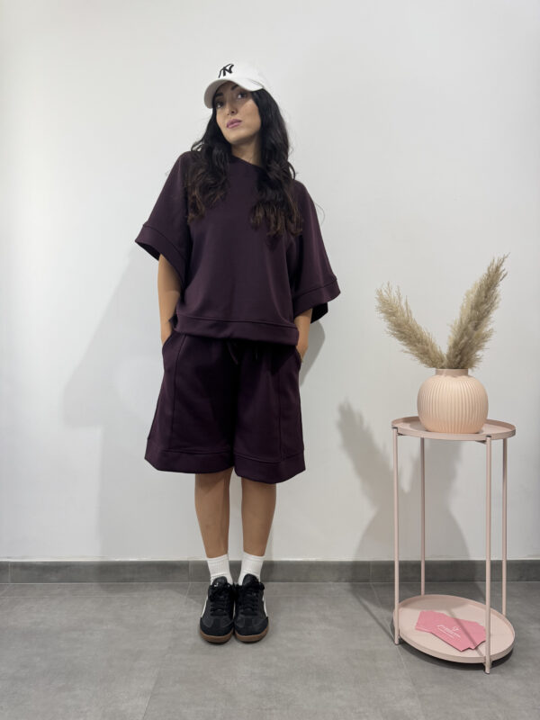 Completo comodo sportivo color prugna composto da pantalone corto largo e maglia larga a maniche a tre quarti.