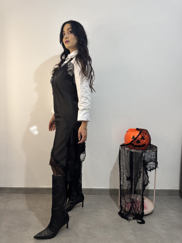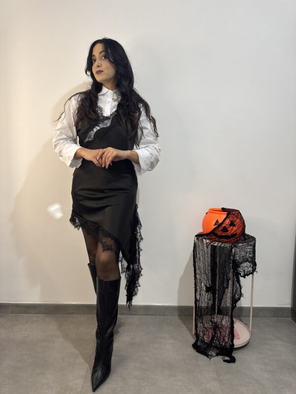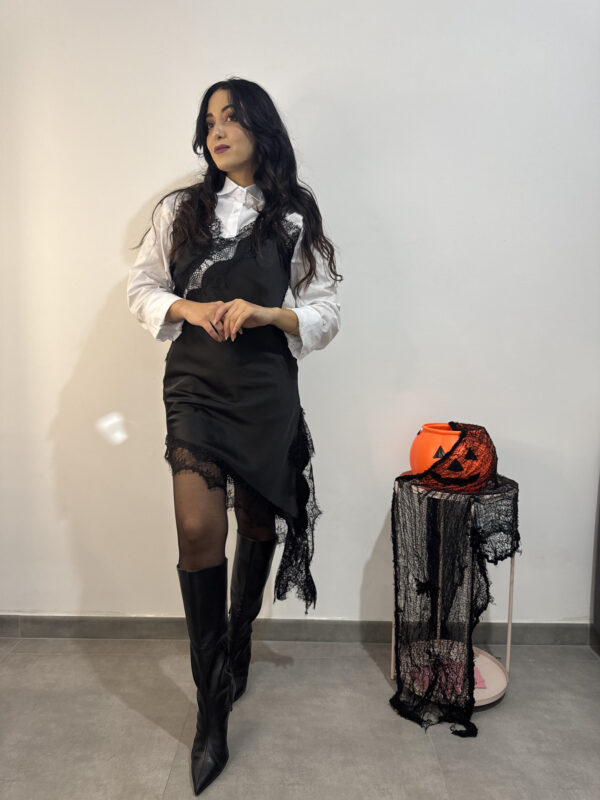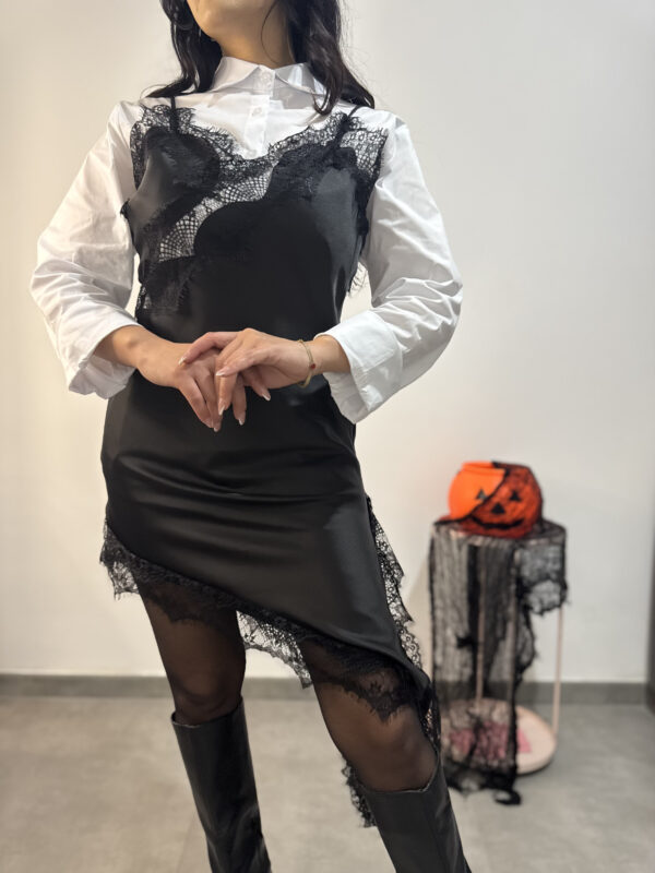 Abito asimmetrico satinato con inserti e fusciacca in pizzo.