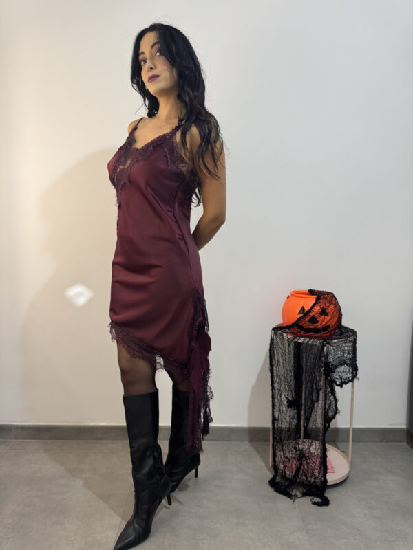 Abito asimmetrico satinato con inserti e fusciacca in pizzo.