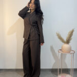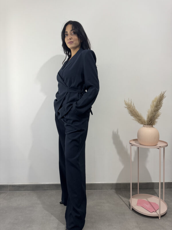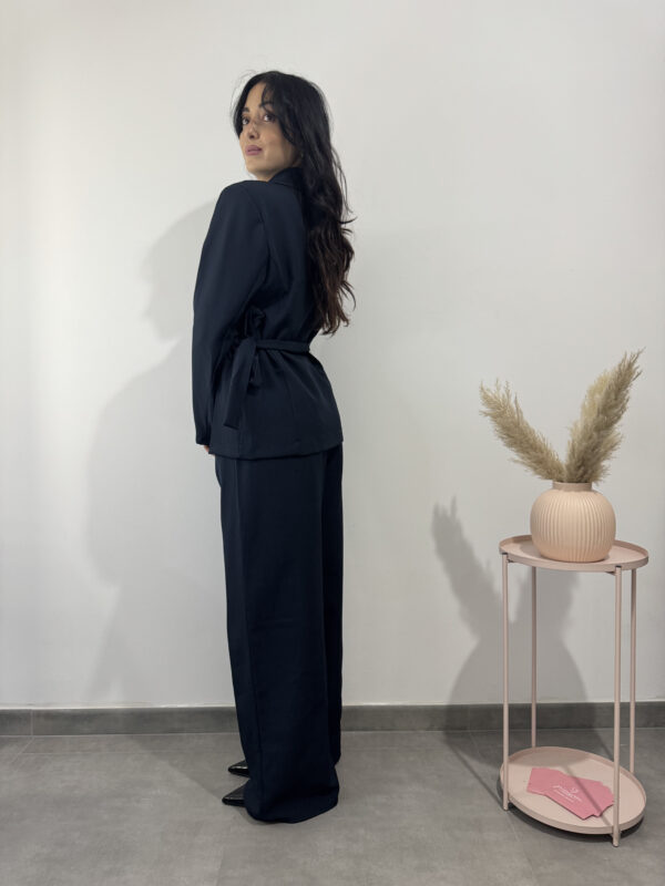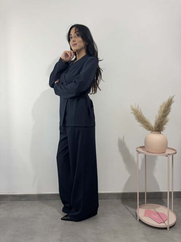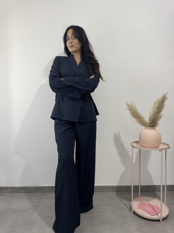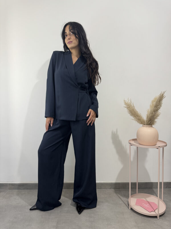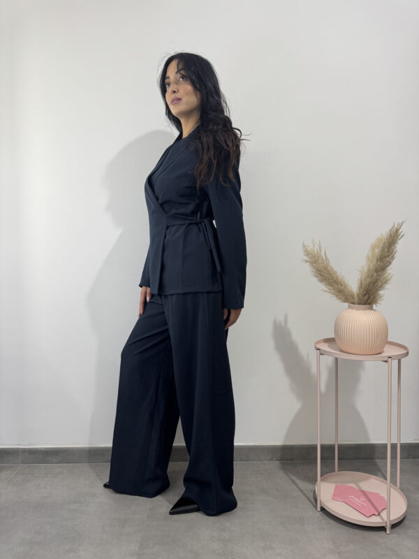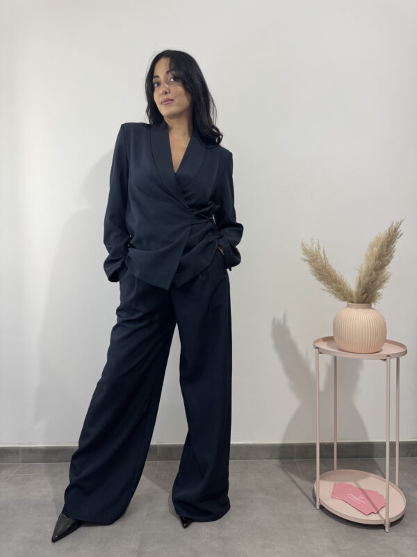 Tailleur blu composto da giacca con chiusura a portafoglio e pantalone largo con tasche.