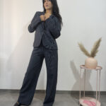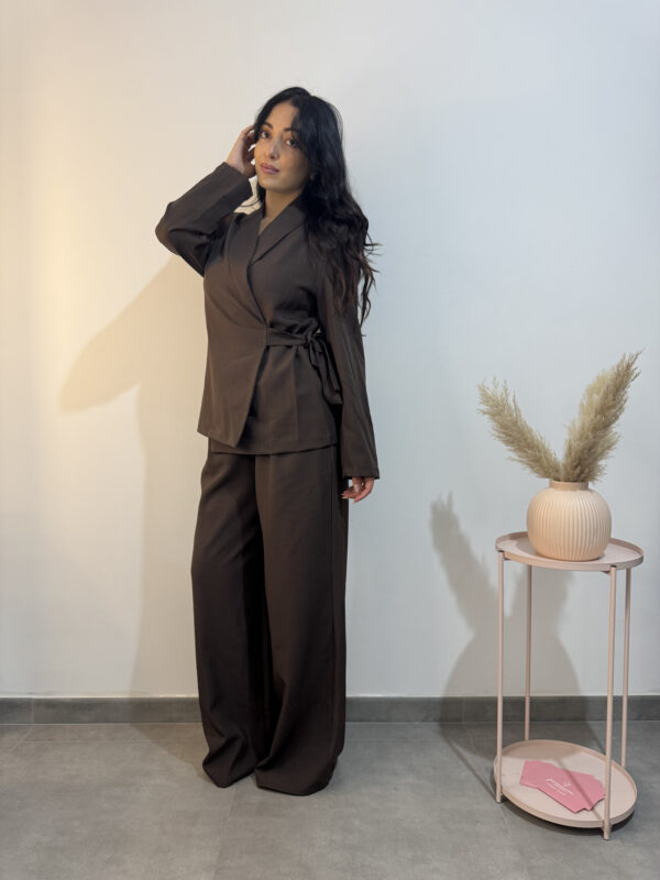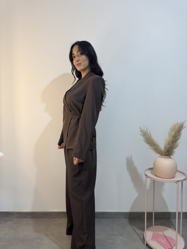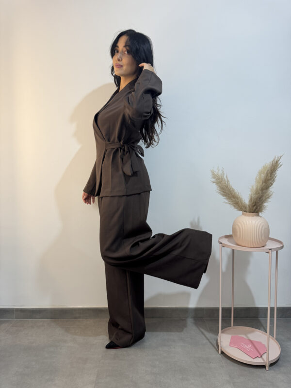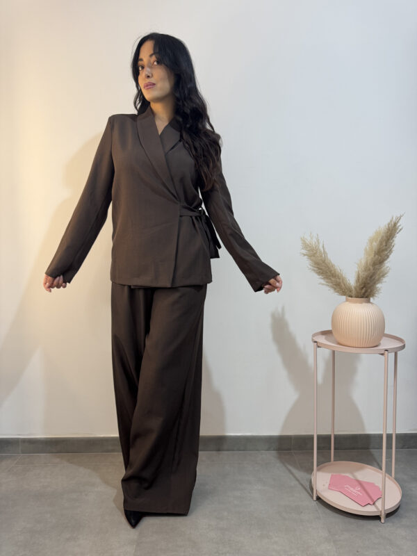 Tailleur marrone composto da giacca con chiusura a portafoglio e pantalone largo con tasche.