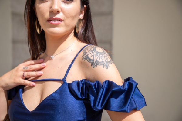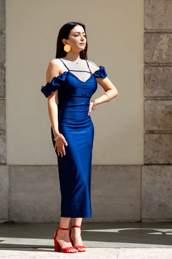 Abito satinato blu notte midi con rouches sulle spalline, scollato dietro e con spacco laterale. Vestito romantico per tutte le occasioni.