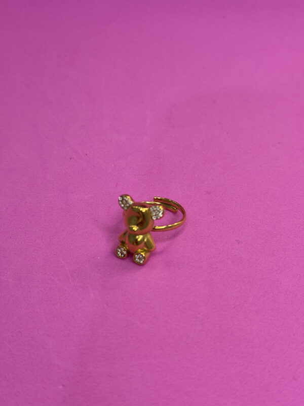 Anellino dorato con teddy e strass, fedina regolabile. Must have di stagione.