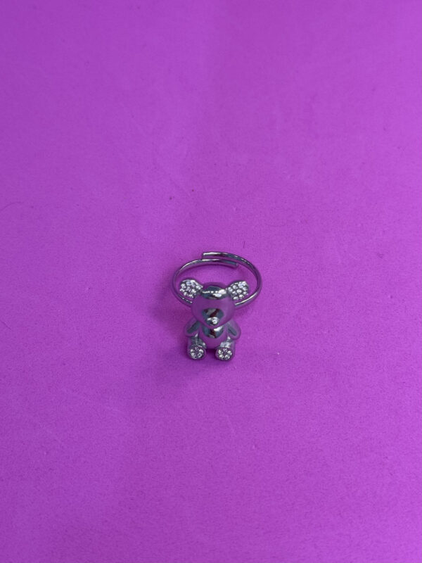 Anellino argentato con teddy e strass, fedina regolabile. Must have di stagione.