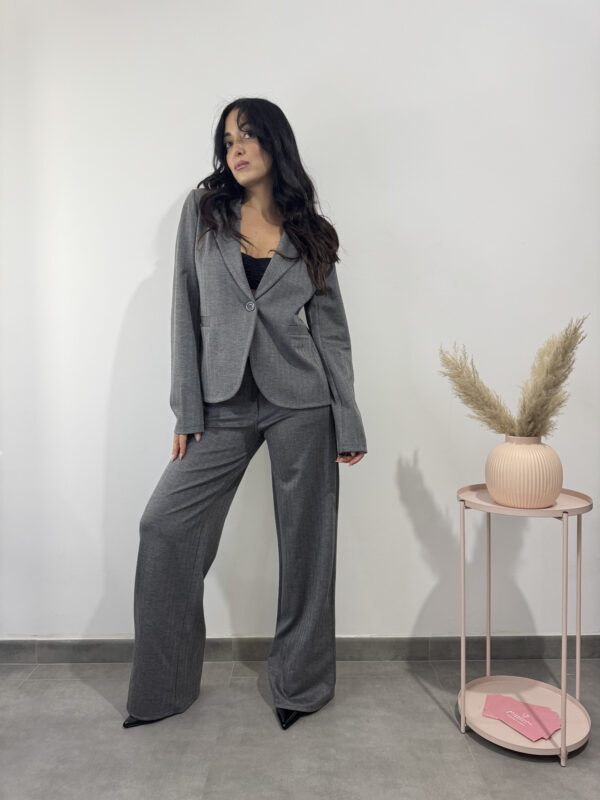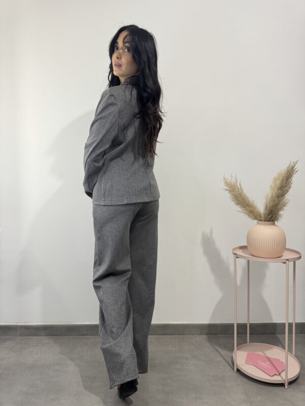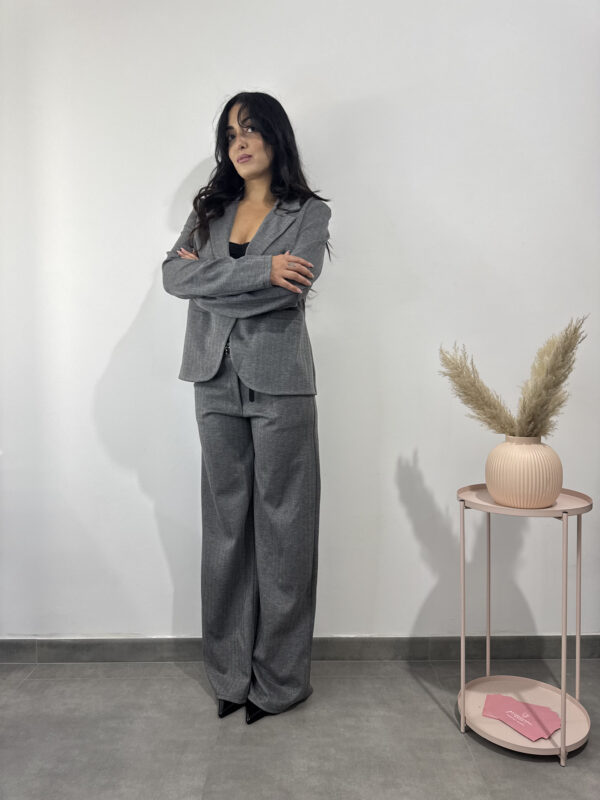 pantalone formale a costine grigio, dritto con tasche e cintina nera.