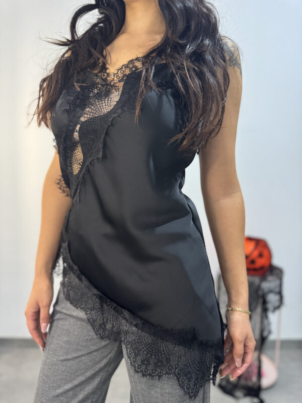 Canotta asimmetrica satinata con inserti e fusciacca in pizzo.