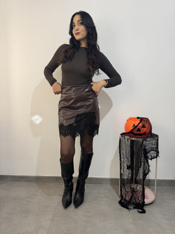 Gonna corta in pelle con pantaloncino interno, mini spacco laterale e inserti in pizzo.