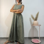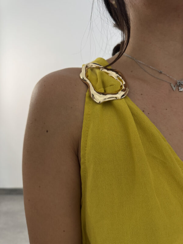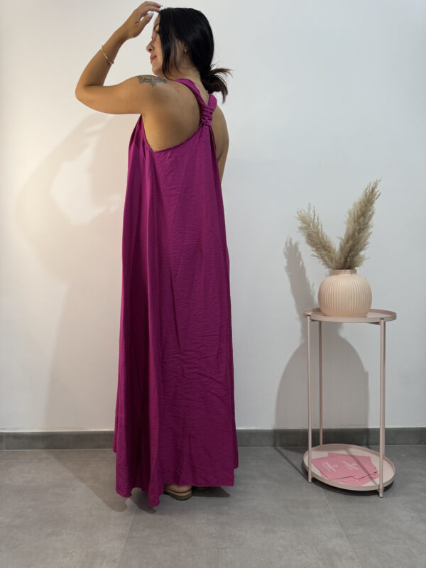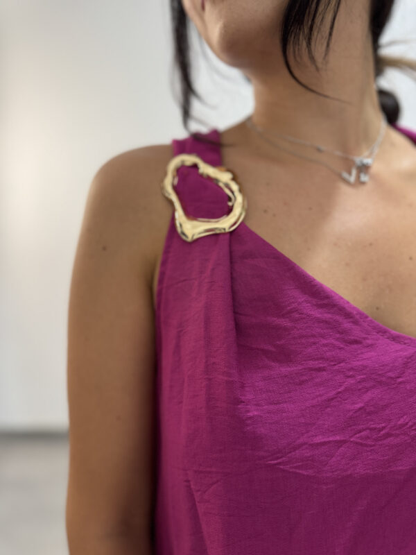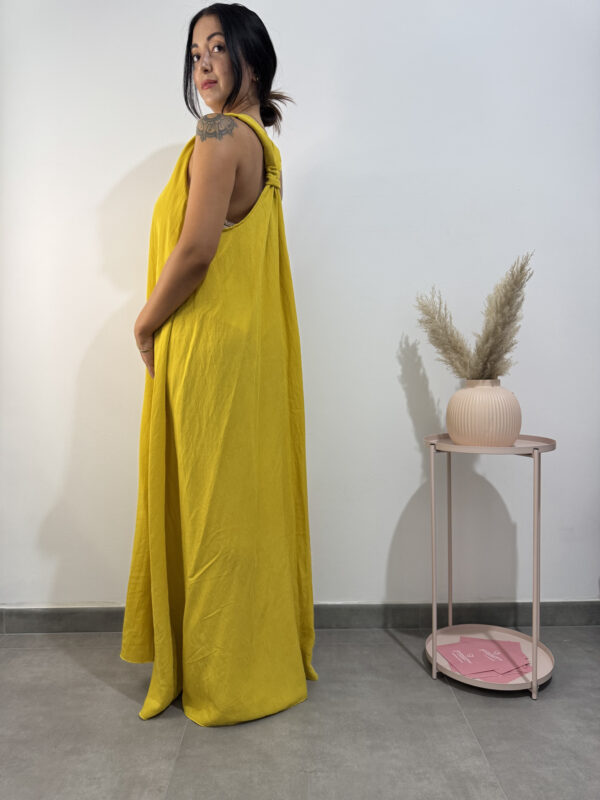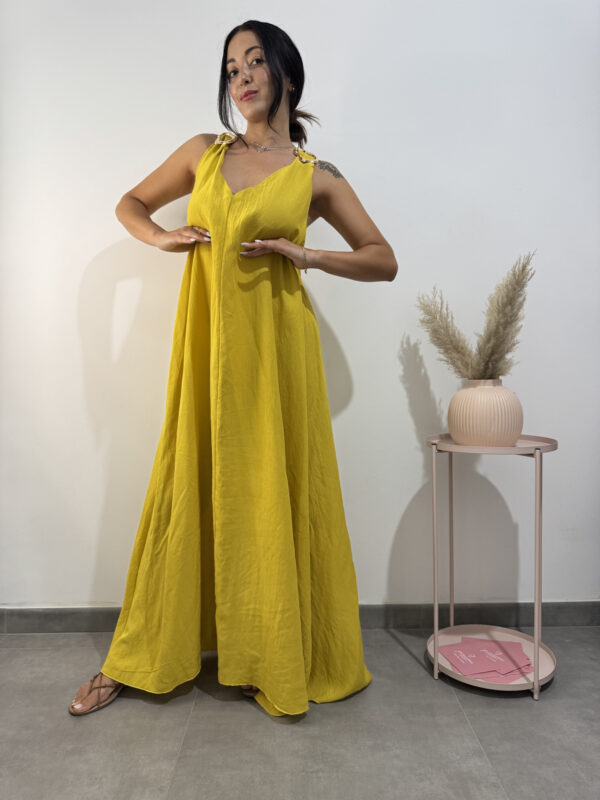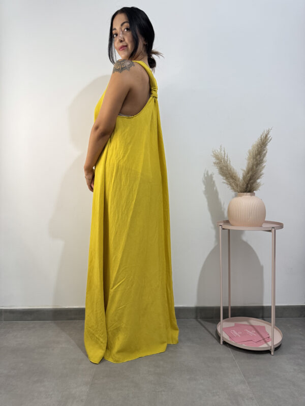 Abito tunica ampio e lungo, smanicato con scollo a V, dettagli dorati sulle spalline e nodo sulla schiena.